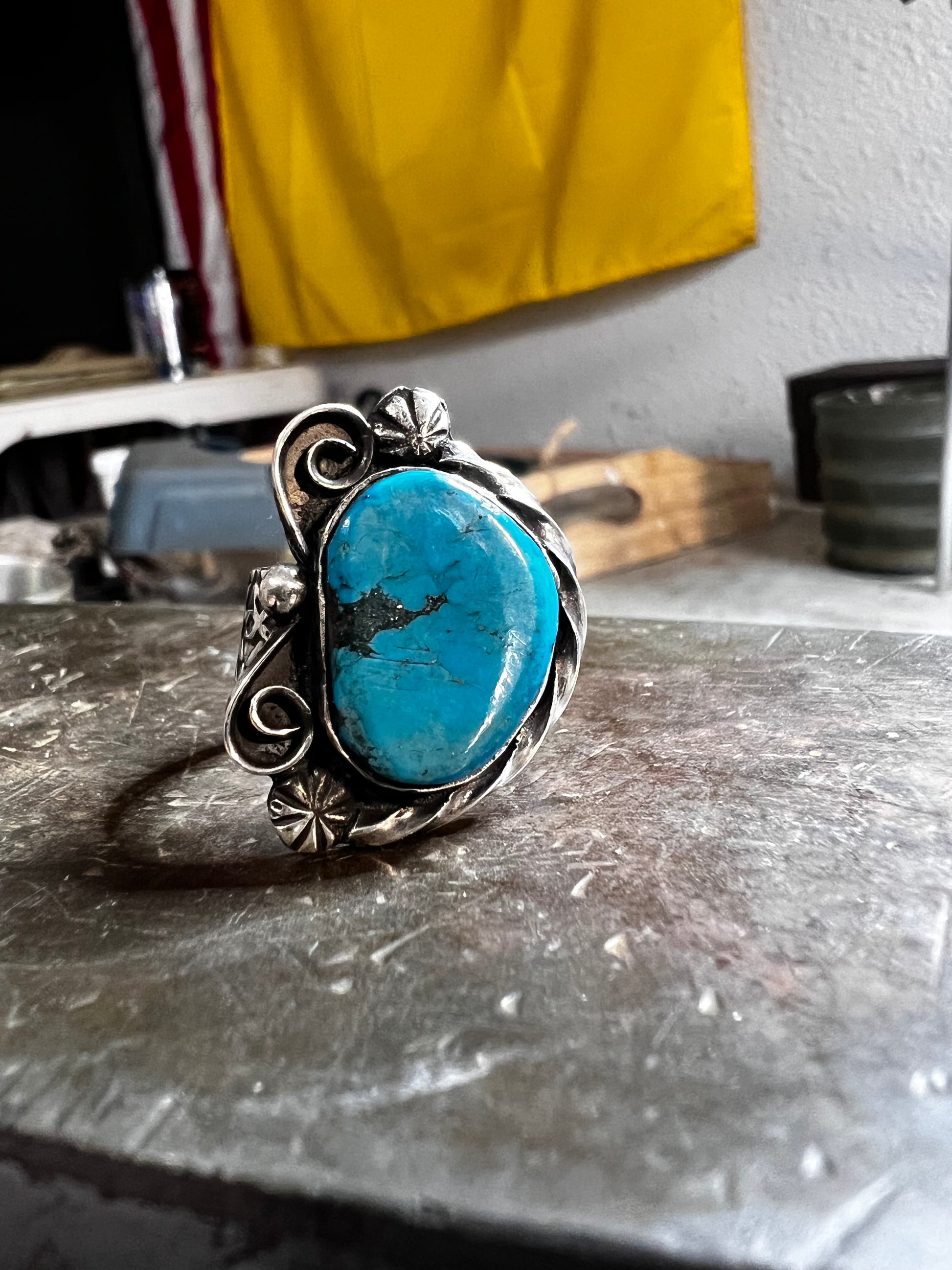 Handmade sterling silver and Morenci turquoise ring. Size 8
