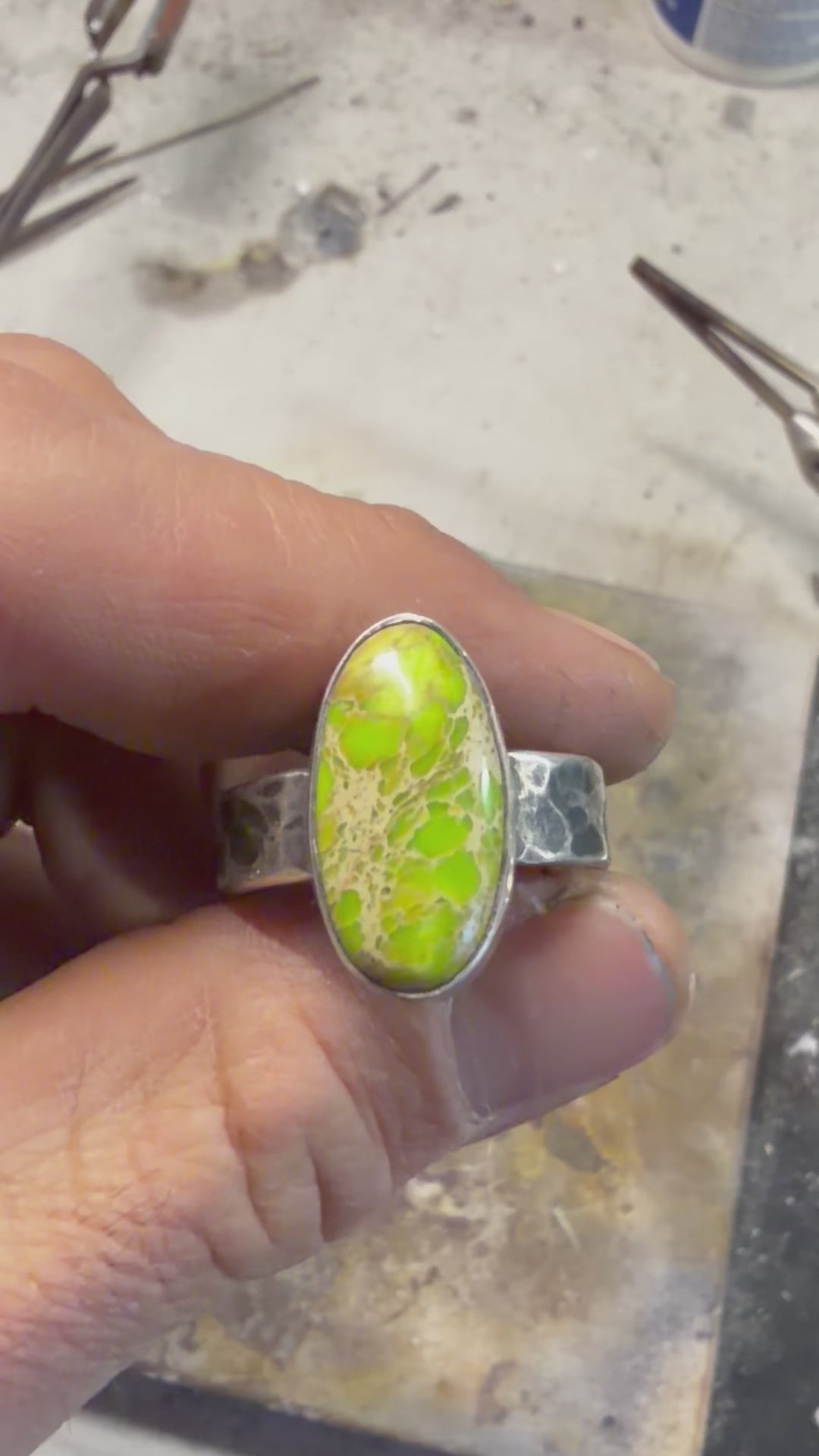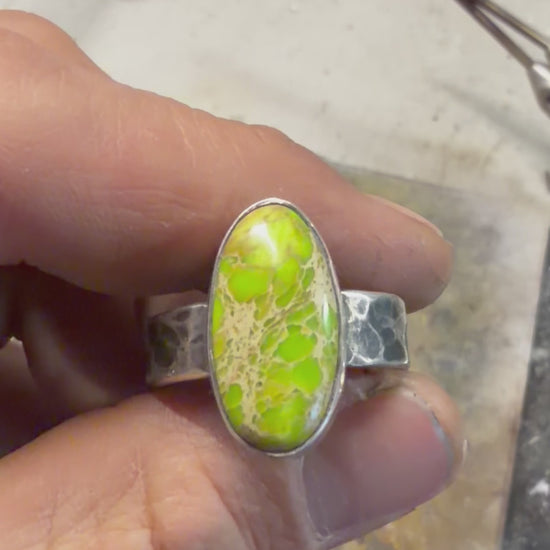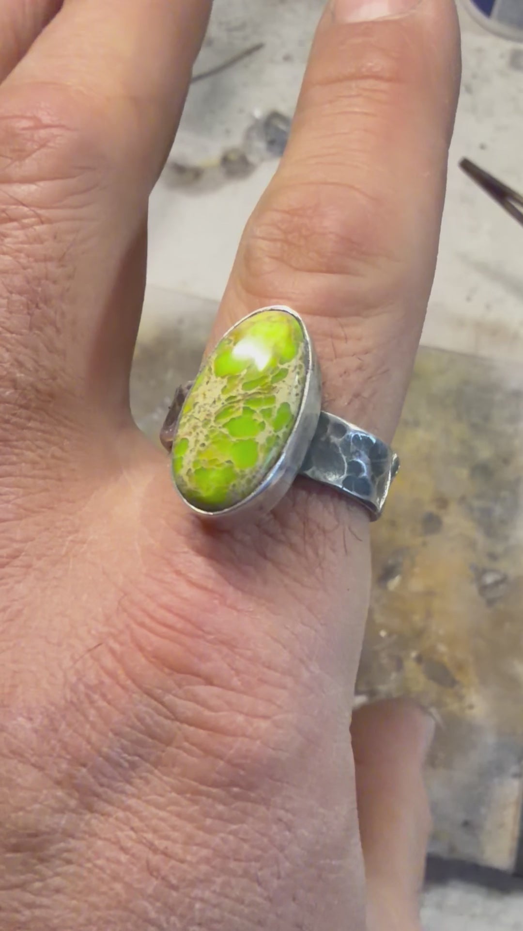 Handmade sterling, silver and green apple Hubie turquoise ring size 12. This ring was hand casted with a nice hammer finish.
